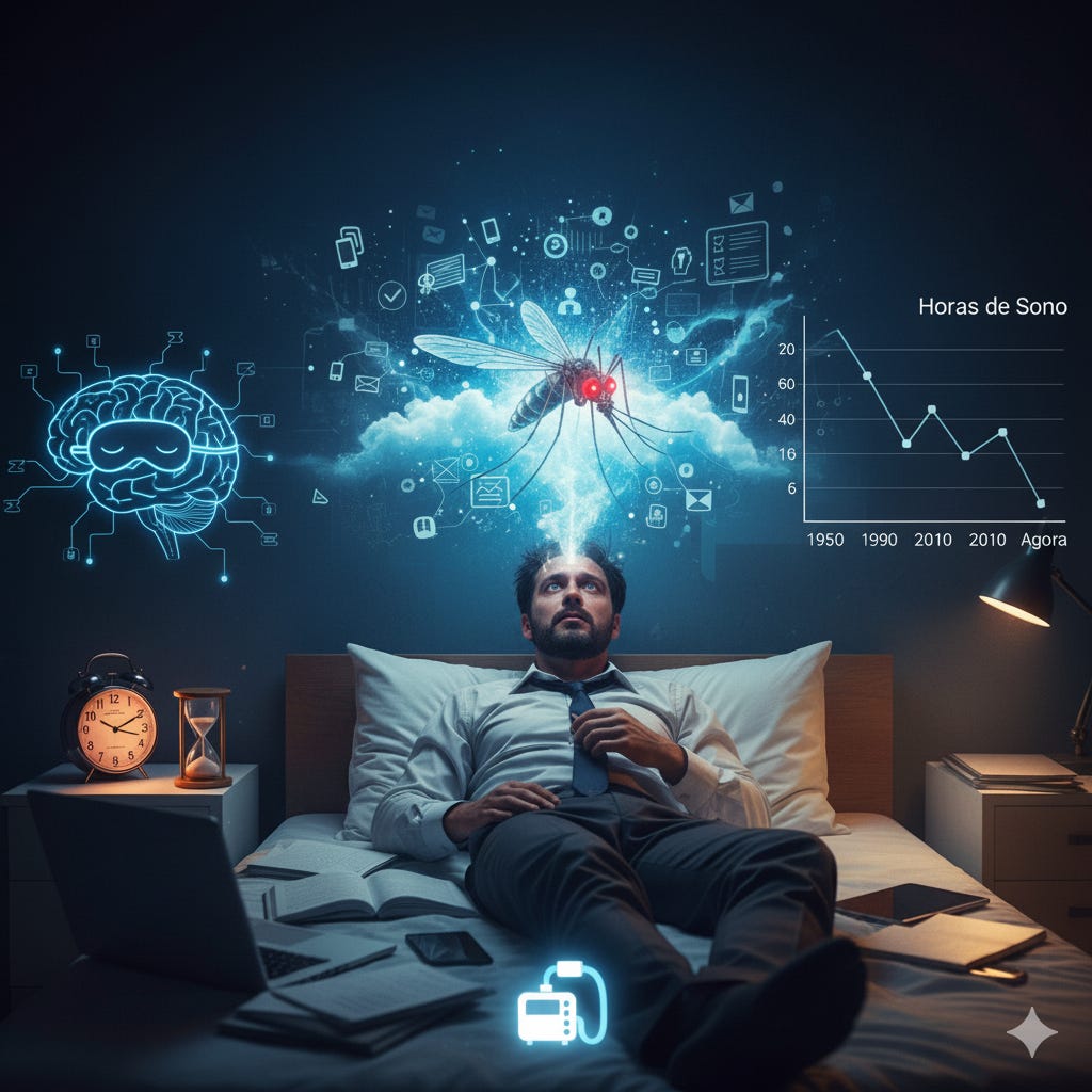 No início do século XX, ou seja, antes do advento da eletricidade, nós dormíamos em média de 9 a 10 horas de sono. Já na década de 1950, esse número caiu para 8/9 horas de sono. O número continuou reduzindo para chegar a 7/8 na década 1990, de 6.5/7.5 na década de 2010, e por fim, 6 a 7 horas.